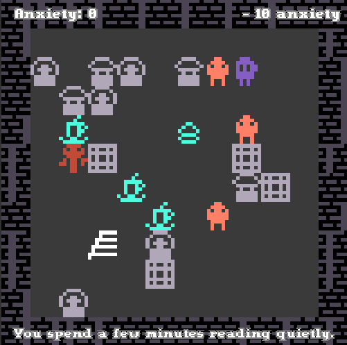 Expiety is a small survival game about my experience going to GDC that I built for #notGDCJam2019. I have horrendeous anxiety the longer I’m at GDC, and I replicated it here. Movement will increase your anxiety, but you can find places that give you food or quiet corners that can help to reduce it. You might also find people who want to talk to you or situation where you are overwhelmed and your anxiety increases.